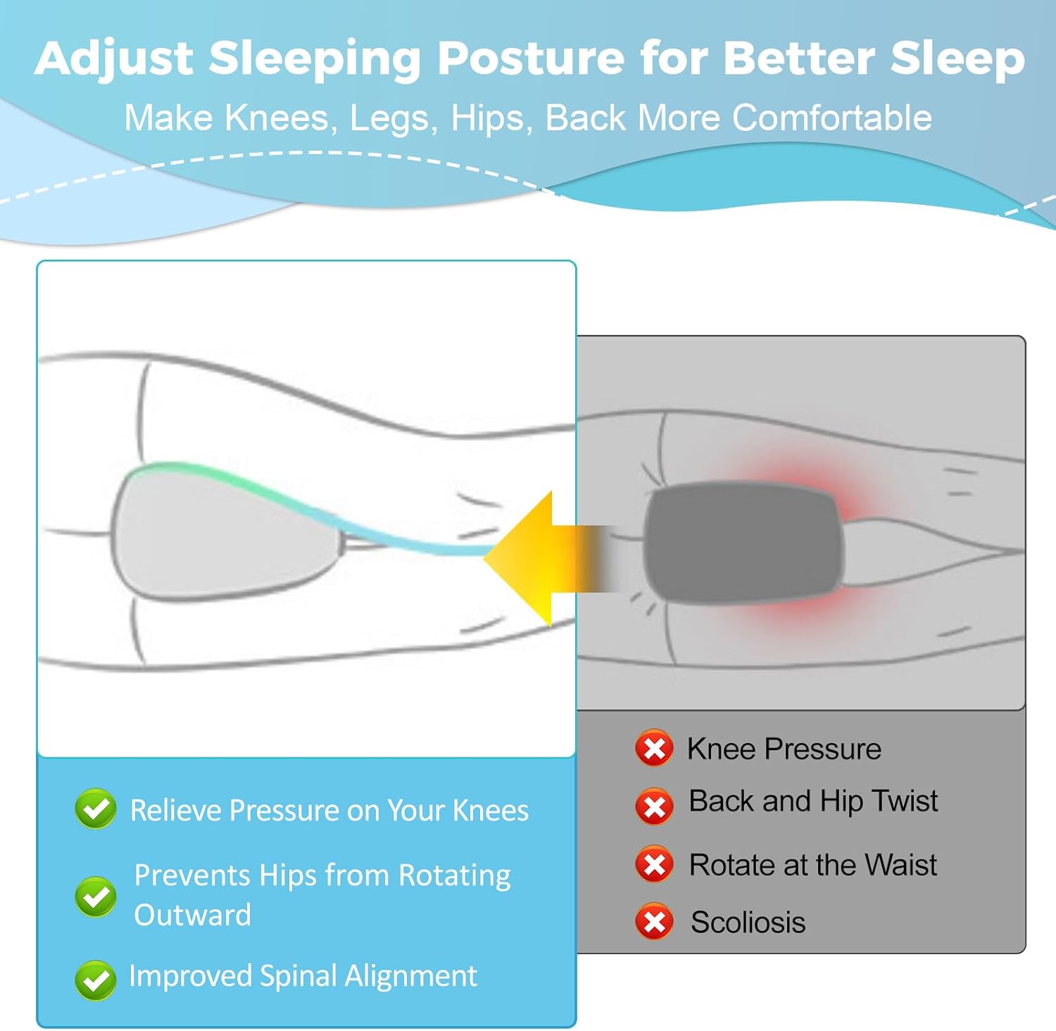 Side sleeping without support can strain the hips, knees, and lower back. The knee pillow creates a natural gap between your legs, reducing pressure and helping your muscles relax. Proper alignment improves blood flow and reduces discomfort, making sleep more restful.
